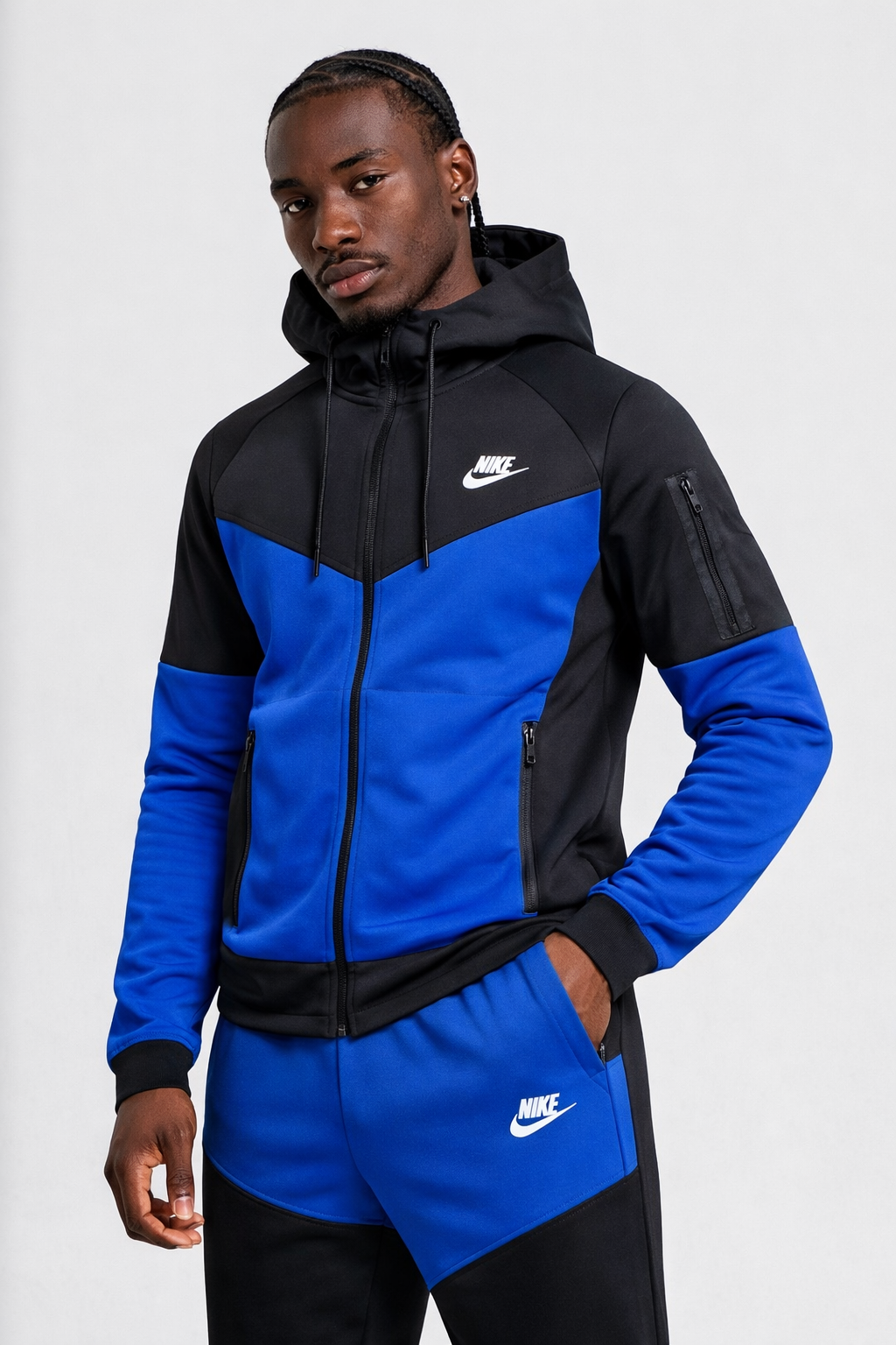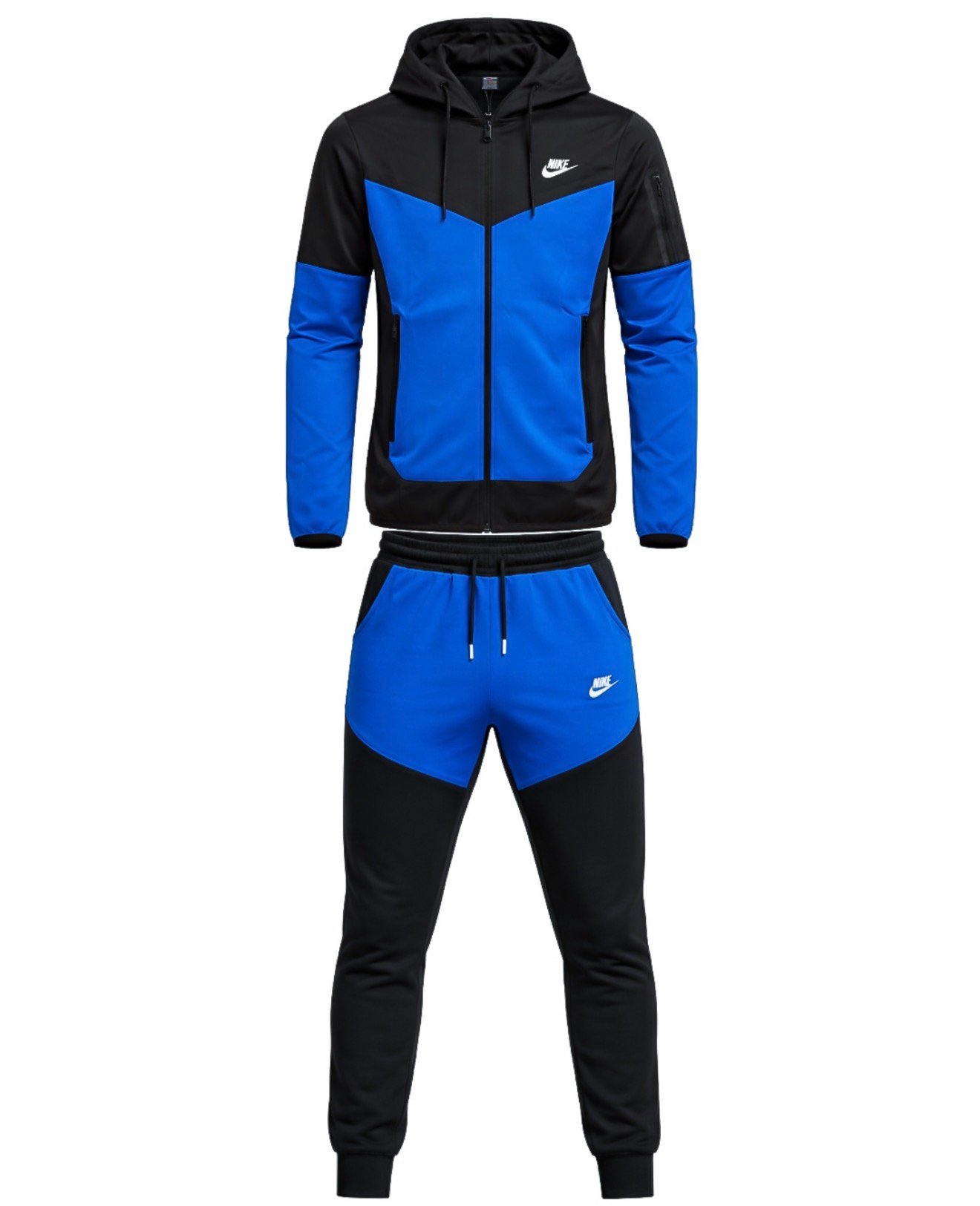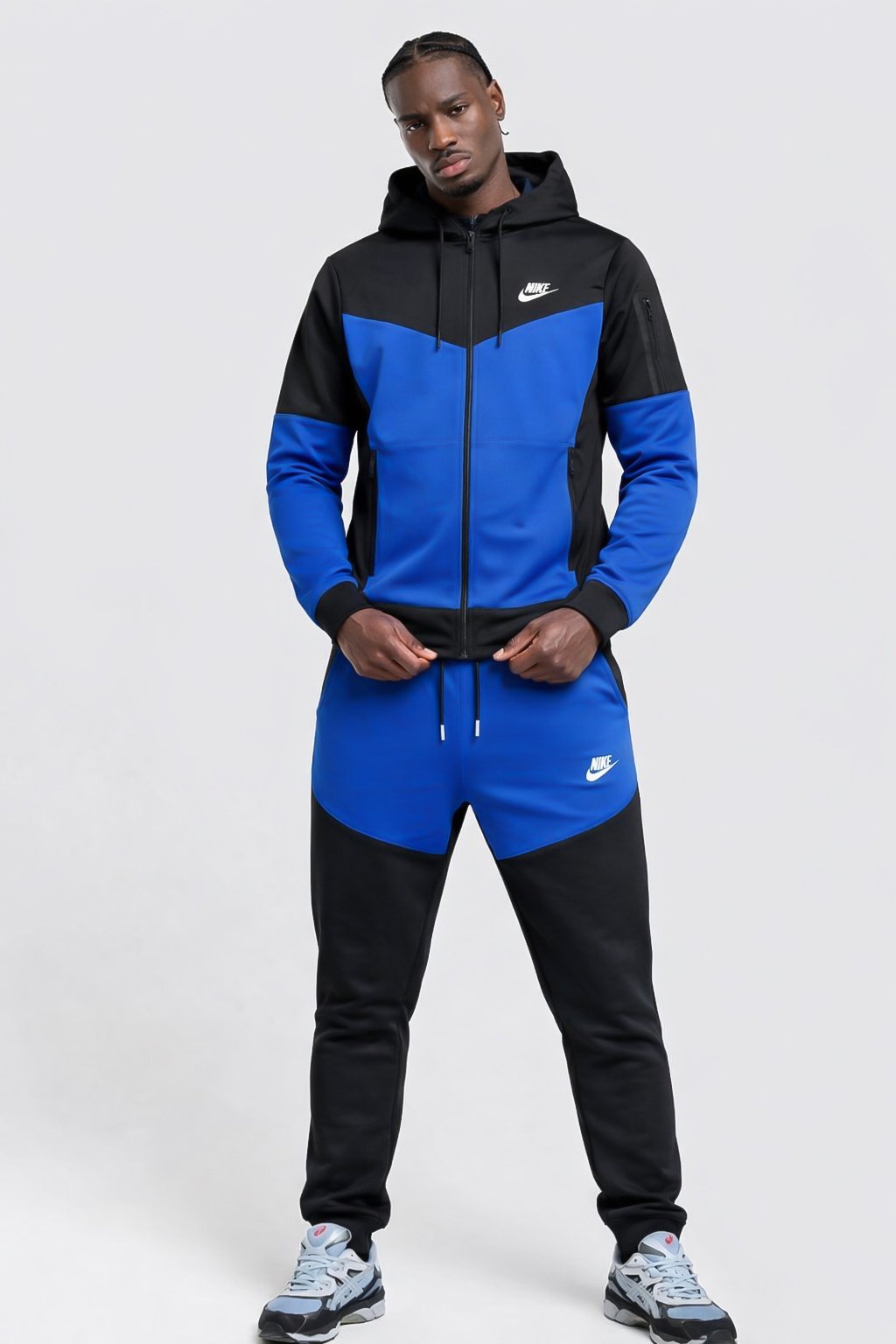 Cet ensemble Nike à capuche se distingue par son design bicolore noir & bleu électrique, parfait pour un look streetwear moderne.